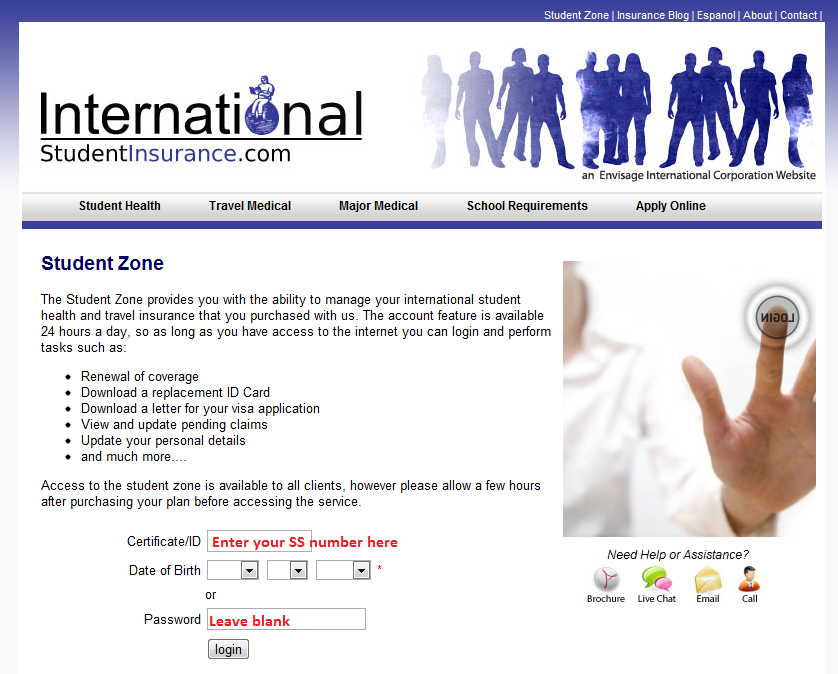 2. Once you know your certificate number you will be able to log on to your Student Zone account. (http://www.internationalstudentinsurance.com/student-zone/). Enter your certificate number where it says “Certificate ID” and enter your Date of Birth. You do not need to have a password to log in, so you can leave it blank.